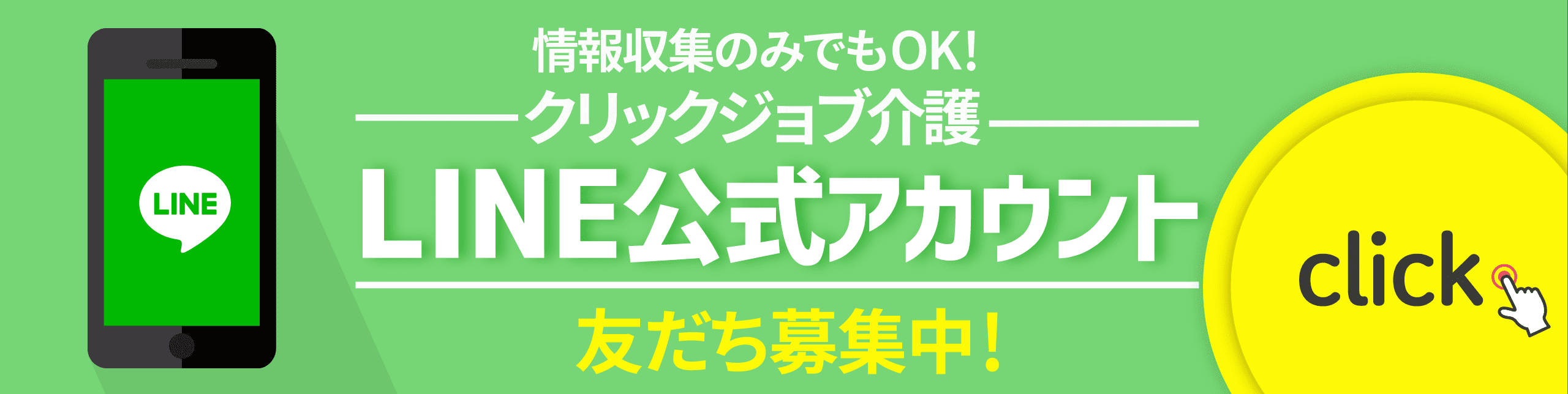 01 多くの求人情報の中から、ご希望にピッタリの職場を紹介します! 【クリックジョブ介護】は、医療介護業界に特化した転職支援サイトです。厚生労働省の許可を受けた正式な団体が運営する、介護業界で働く方のための無料の転職支援サービス、いわば介護版ハローワークです。 対象エリアは全国、お住まいの地域の求人情報に精通したエージェントが、あなたのご希望に合った求人をご紹介いたします。 対象職種は、介護職、ケアマネジャー、生活相談員、オペレーター、管理職(リーダー、管理者、施設長)、リハビリ職(理学療法士、作業療法士)、看護職など。 働く施設は、病院・クリニック、特別養護老人ホーム、有料老人ホーム、介護老人保健施設、デイサービス・デイケア、訪問介護など、非公開求人も多数ご紹介できますので、あなたにピッタリの新しい職場が見つかります。 02 専任の転職エージェントが、転職活動全般をプロの立場からサポートします! 「限られた求人情報や間違った知識で転職をしてほしくない」という思いから、私たちは、お一人お一人に専任の転職エージェントが、転職活動を最初から最後までバックアップする様々なサービスを提供しております。 転職エージェントがご登録いただいたお客様一人一人に、転職に関するご希望をお伺いし、当社独自のネットワークで得た情報を駆使し、あなたにピッタリの求人をご紹介いたします。 気に入った求人を見つけた後も、書類選考や面接の手続き、履歴書・職務経歴書の添削や面接練習、その他条件交渉など、手間のかかる作業や専門知識は専任の転職エージェントがサポートいたします。 03 サービスは全て無料! サービスは、すべて無料でご利用いただけます。ご登録から、 求人検索・紹介、書類選考・ 面接のサポート、専任の転職エージェントへのご相談まで、すべてのサービスをご利用いただくのに、費用は一切かかりません。また 【クリックジョブ介護】は、LINEでも転職サポートを受けることができます。お電話が苦手な方、今すぐの転職は考えていないけど情報収集したい方にオススメです。【クリックジョブ介護】は、「転職して良かったな」と思っていただけるように、あなたの転職活動をあらゆる面からサポートいたします。