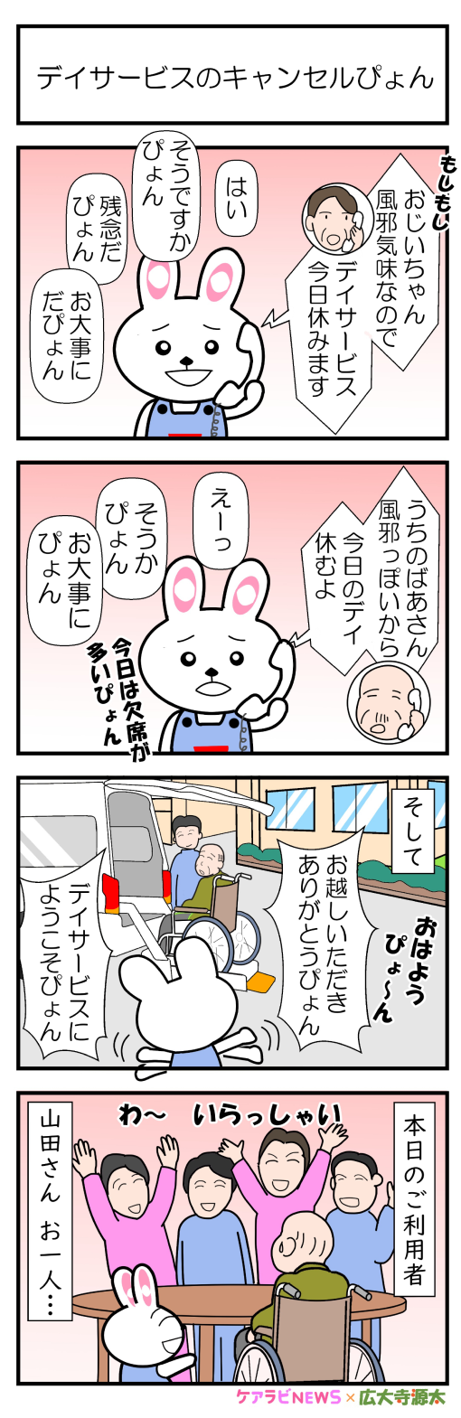 介護あるある 【4コマ漫画】80-デイサービスのキャンセルぴょん~新人介護職員物語~ 次回もお楽しみに! ▼4コマ漫画一覧はこちら!介護あるある4コマ漫画×広大寺源太先生コラボ【全話まとめ】2019.3.1この度、ケアラビNEWSが介護歌留多(カルタ)の広大寺源太とコラボレーションを実施することになりました。 広大寺源太は以前オススメブログでも紹介しました、 独特のユーモア、絶妙な脱力感で4コマ漫画、介...