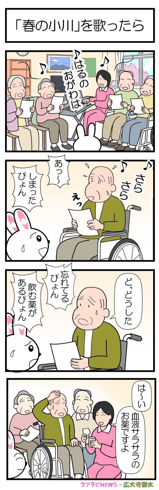 介護あるある 【4コマ漫画】83-「春の小川」を歌ったら~新人介護職員物語~ 次回もお楽しみに! ▼4コマ漫画一覧はこちら!介護あるある4コマ漫画×広大寺源太先生コラボ【全話まとめ】2019.3.1この度、ケアラビNEWSが介護歌留多(カルタ)の広大寺源太とコラボレーションを実施することになりました。 広大寺源太は以前オススメブログでも紹介しました、 独特のユーモア、絶妙な脱力感で4コマ漫画、介...