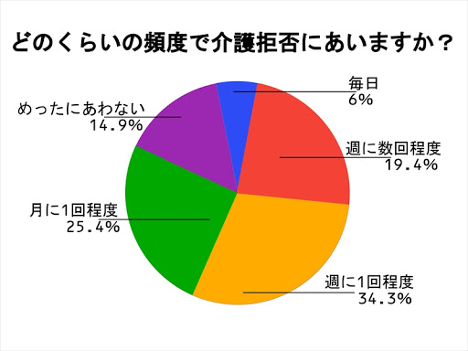 「介護拒否にあったことがある」といっても、その頻度をみてみるとバラバラ。毎日介護拒否にあうと回答した方は全体の6%とごく少数でした。週に1回程度介護拒否にあうと回答した方が最も多い結果となりました。