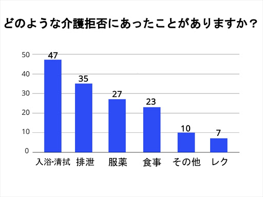 「どのような介護拒否にあったことがありますか?」という質問に対して、最も多かった回答は、「入浴拒否・清拭拒否」、次いで「排泄介助に関わる拒否行動」でした。入浴や排泄は、サポートされることに対して恥ずかしいと感じる利用者様が多く、拒否反応が起こりやすいようです。