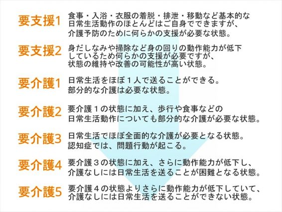 【要介護】とは、日常的な基本的動作を自ら行うことが難しく、現段階で介護が必要な状態、【要支援】とは、今は介護の必要はないものの、日常生活に支援が必要である状態のことを指します。【要介護】は要介護1~要介護5、【要支援】は要支援1・要支援2のレベルに分かれていて、その方の介護または支援が必要な度合いを表しています。