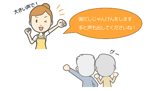 参加者の皆さんが下を向いてしまっているときは、「私の真似をしてください」といって自分に注目してもらいましょう。また、イラストのように手が「チョキ」なのに掛け声が「グー」のような異なった動作を入れることで、より面白くなります。