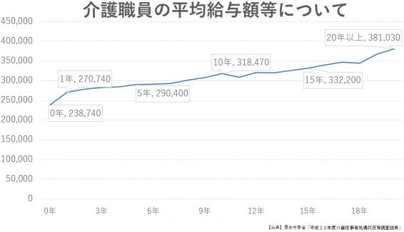 平成30年度介護従事者処遇状況等調査結果によると、1年⽬の新⼈職員の給与の平均は270,740円で、勤続20年の職員の平均給与は381,030円と約11万円程度の増額となっています。これは⼿当や⼀時⾦も含んだ⾦額になっているので、おおよそ年収324万円〜456万円への増額となります。