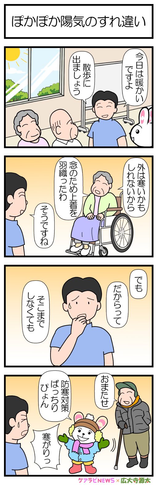 介護あるある 【4コマ漫画】84-ぽかぽか陽気のすれ違い~新人介護職員物語~ 次回もお楽しみに! ▼4コマ漫画一覧はこちら!介護あるある4コマ漫画×広大寺源太先生コラボ【全話まとめ】2019.3.1この度、ケアラビNEWSが介護歌留多(カルタ)の広大寺源太とコラボレーションを実施することになりました。 広大寺源太は以前オススメブログでも紹介しました、 独特のユーモア、絶妙な脱力感で4コマ漫画、介...