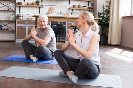 「ハッハッハッ」「ホッホッホッ」と発声しながらやるのが「笑いヨガ」。不思議なもので、楽しくなくても笑い声を真似して声を出すだけで、本当に楽しくなってきます。