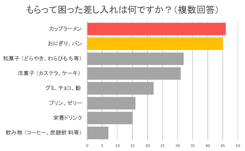 貰って困ったという声が1番多い差し入れは、「カップラーメン」でした。日常生活では、カップラーメンは調理が簡単なため、手軽にお腹を満たすことができるため人気ですが、介護の現場では違うようです。夜勤時は緊急事態が起きやすく、3分待っている間にも呼び出しが入ったり、食べている間に仕事が入ったりしてしまうことも。そして対応中に麺が伸びてしまい、食べられなくなってしまう…なんてことも。