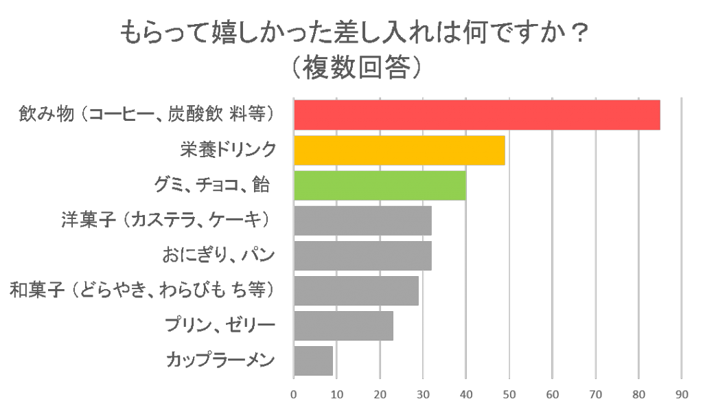 貰って嬉しい差し入れとして2番目に人気だったのは「栄養ドリンク」で、次いで3番目は「グミ・チョコレート・飴」などの簡単に飲む・食べることができる食べ物でした。
